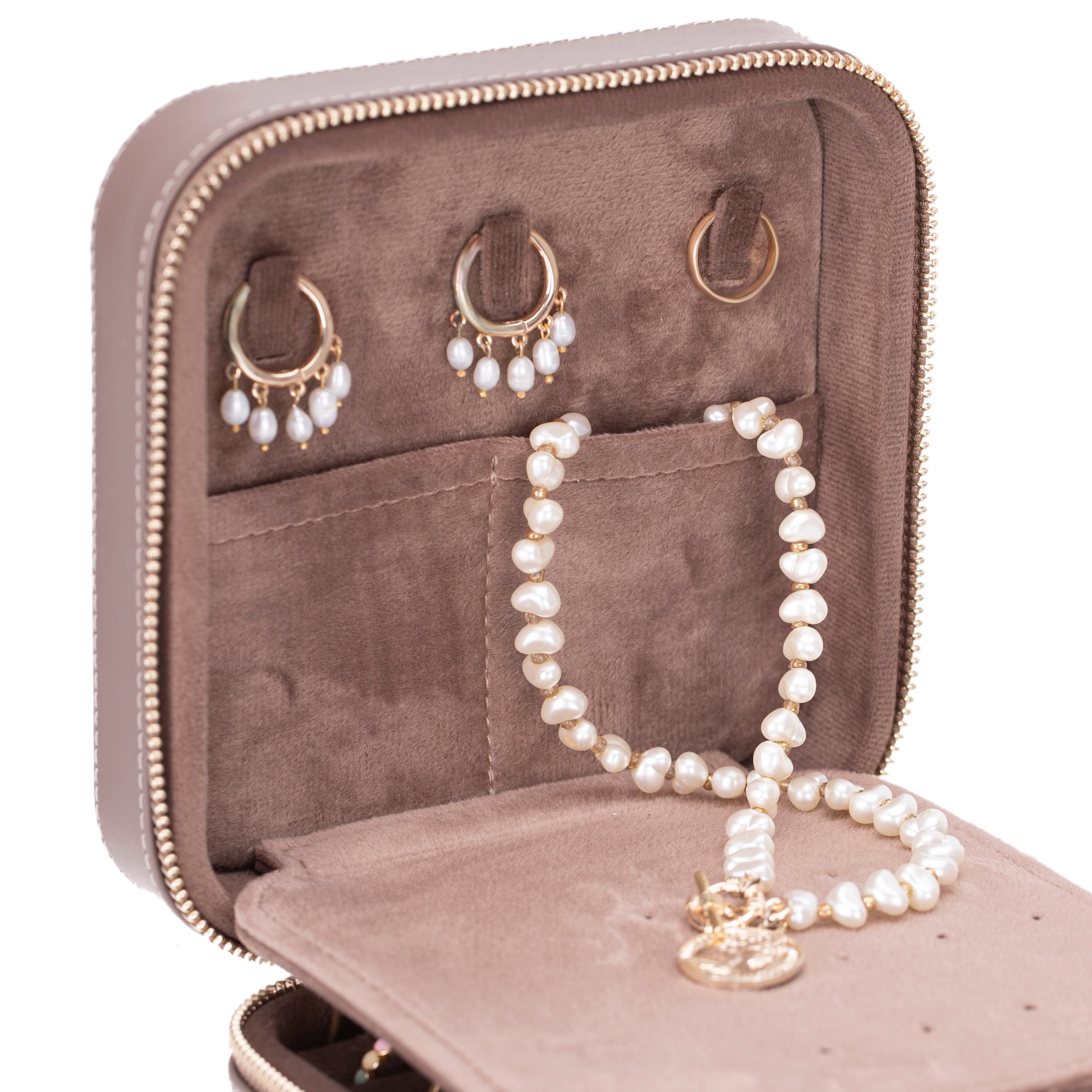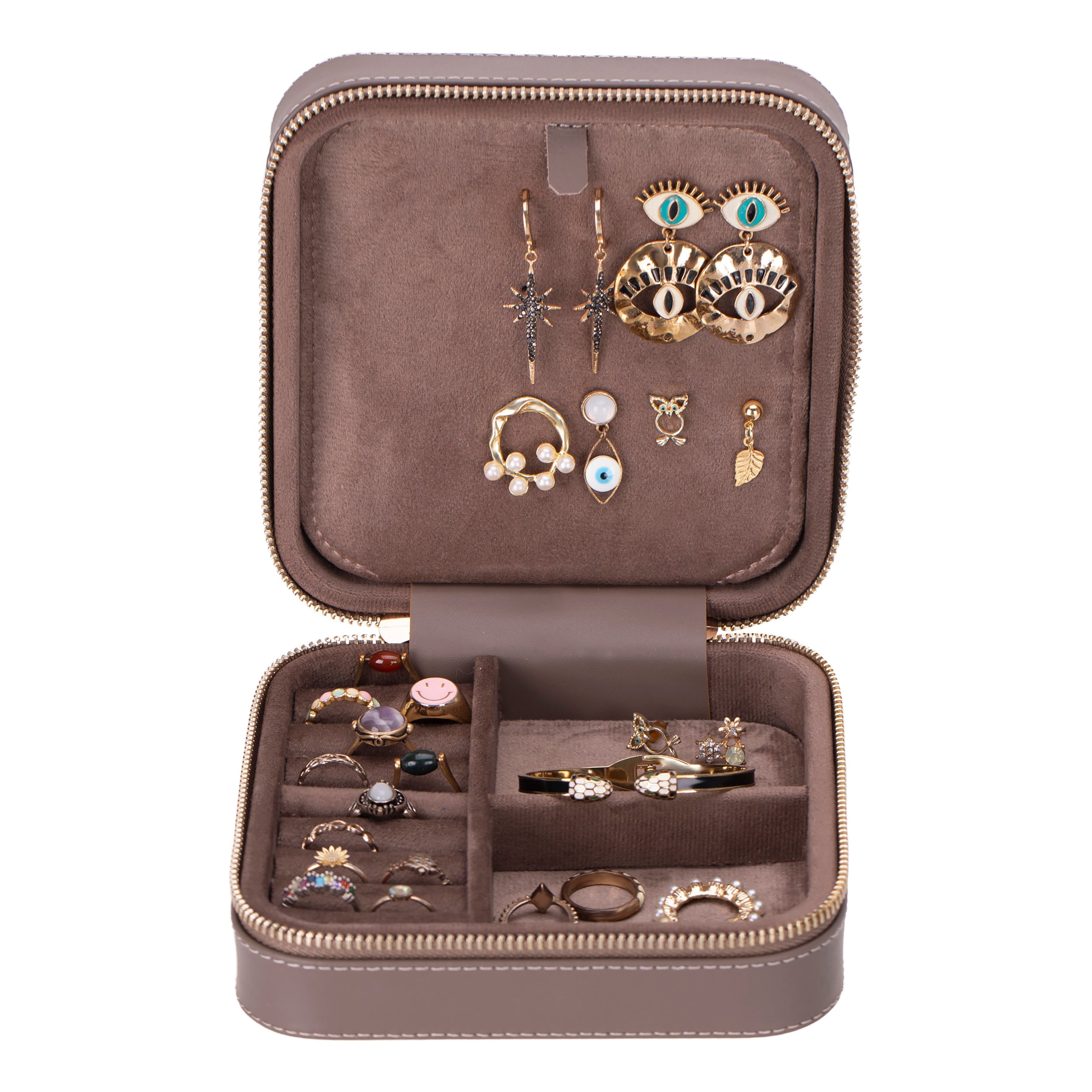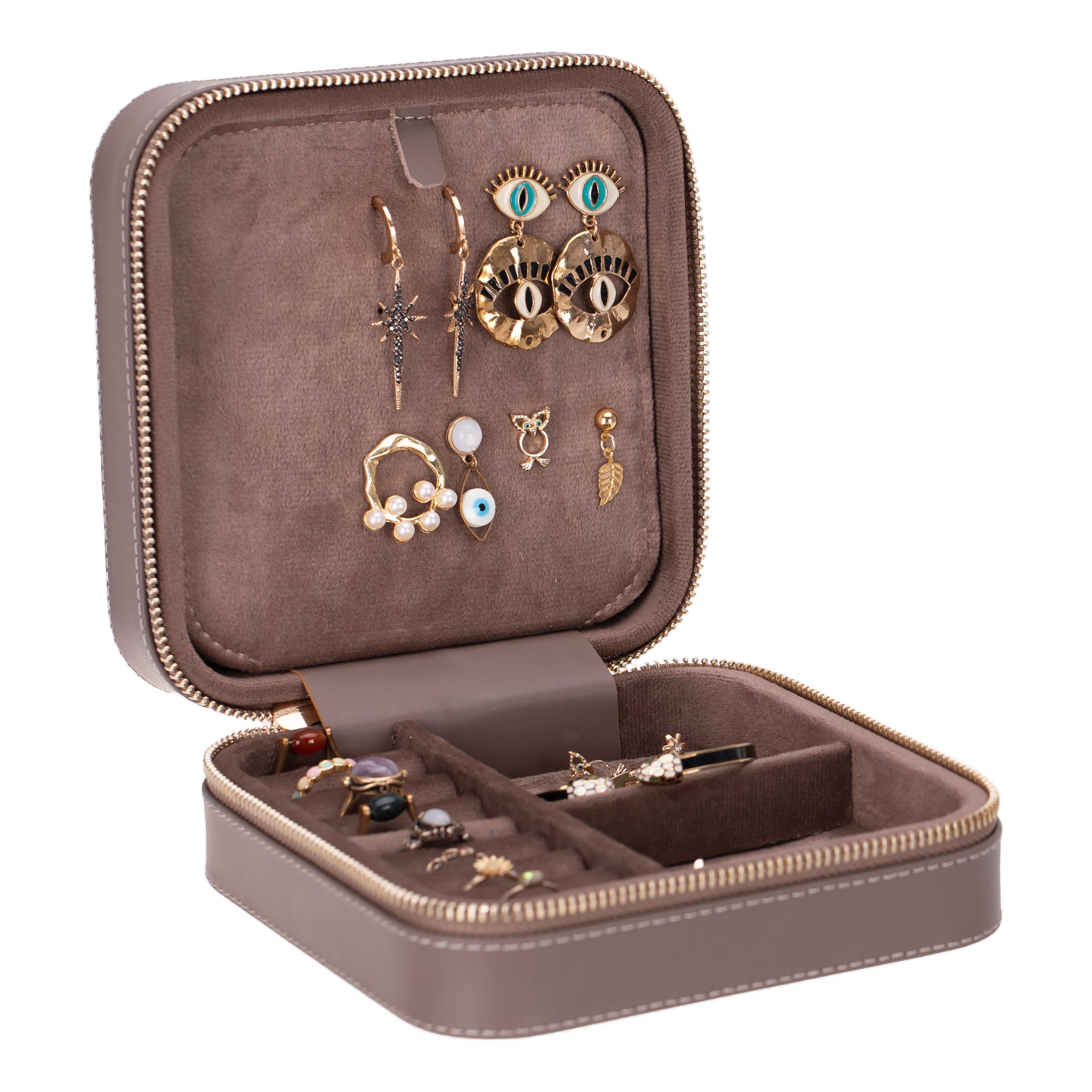 The interior of the organizer box is divided into compartments of various sizes, allowing you to categorize your jewelry efficiently. This way, you can easily find the piece you're looking for and prevent your jewelry from tangling. The soft suede lining protects your jewelry from scratches and damage.